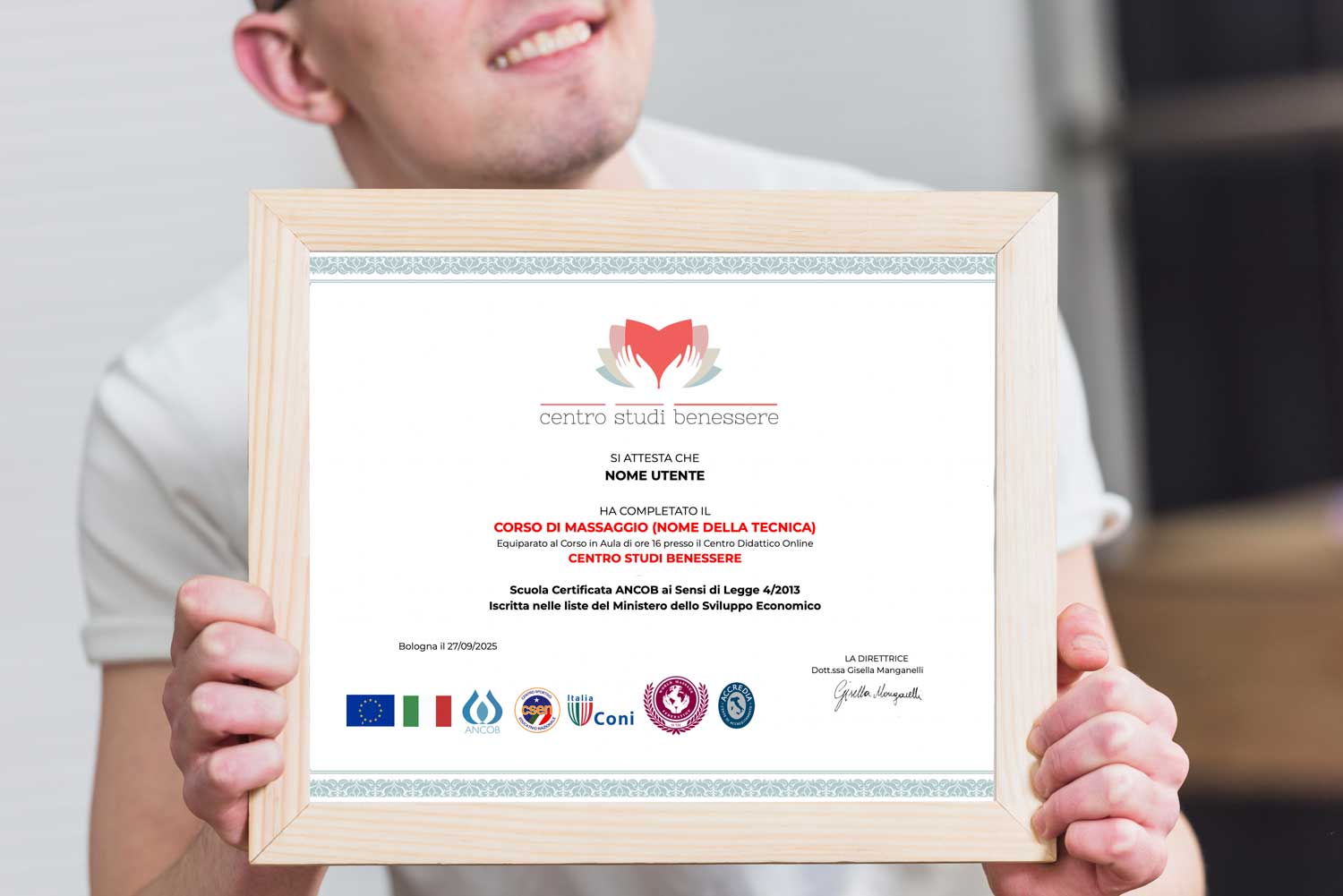 Nuestros certificados están reconocidos y son válidos para el ejercicio de la profesión según la Ley n.º 4 de 2013, aprobada el 14 de enero de 2013 por la Cámara y el Senado y publicada en el Boletín Oficial n.º 22 del 26 de enero de 2013 por ANCOB (Asociación Nacional de Consultores y Operadores de Bienestar), por el CSEN (Centro Deportivo Educativo Nacional), entidad de promoción deportiva reconocida por el CONI, por ACCREDIA y por la WMF (World Massage Federation), organización internacional para operadores de bienestar.